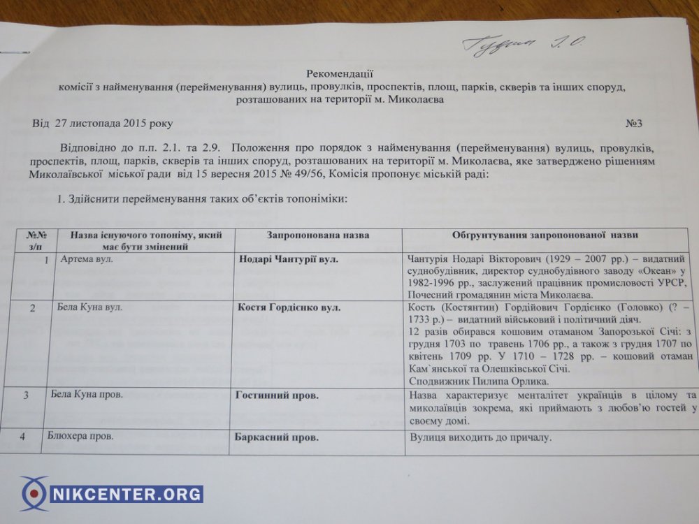 Сегодня, 27 ноября, специально созданная горсоветом комиссия должна была утвердить рекомендации по переименованию объектов топонимики Николаева, которые подпадают под закон о декоммунизации.