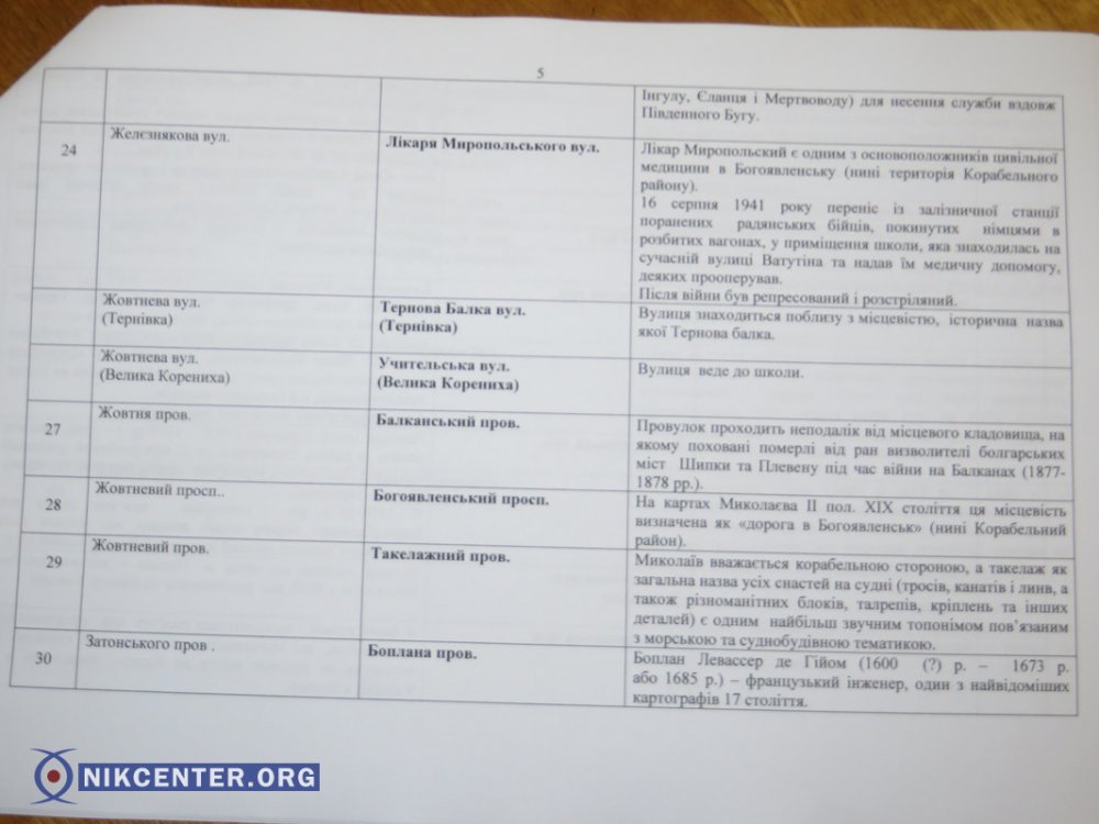 Представитель Николаевской краевой организации Народного Руха Украины Петр Костив заявил, что такие названия улиц, как Виноградная, Конфетная вызывают у него смех. Более того, он выступил за создание новой комиссии, «члены которой бы разбирались в истории».