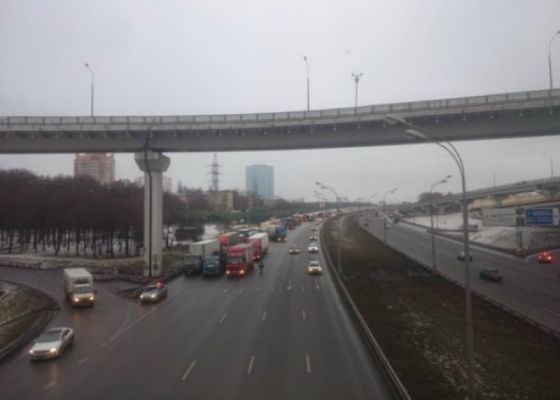 В пятницу днем дальнобойщики перекрыли МКАД, образовалась 10-километровая пробка. Портал отмечает, что фуры стоят в три ряда в районе Ленинградского шоссе.