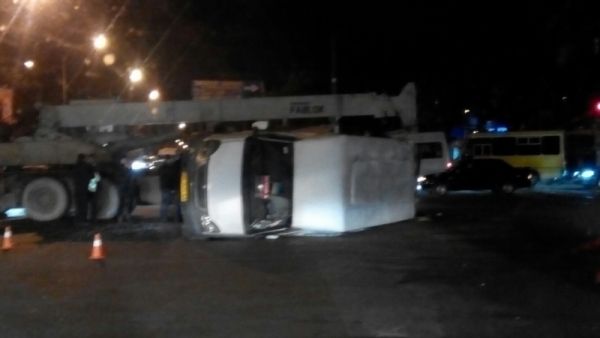По информации очевидцев, пассажирская маршрутка и подъемный кран ехали на мигающий свет светофора и не поделили перекресток. Подъемный кран буквально снес зад маршрутки.