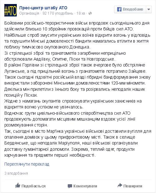 Кроме того, террористы из стрелкового оружия и гранатометов неприцельно обстреливали Авдеевку, Опытное, Пески и Новгородское.