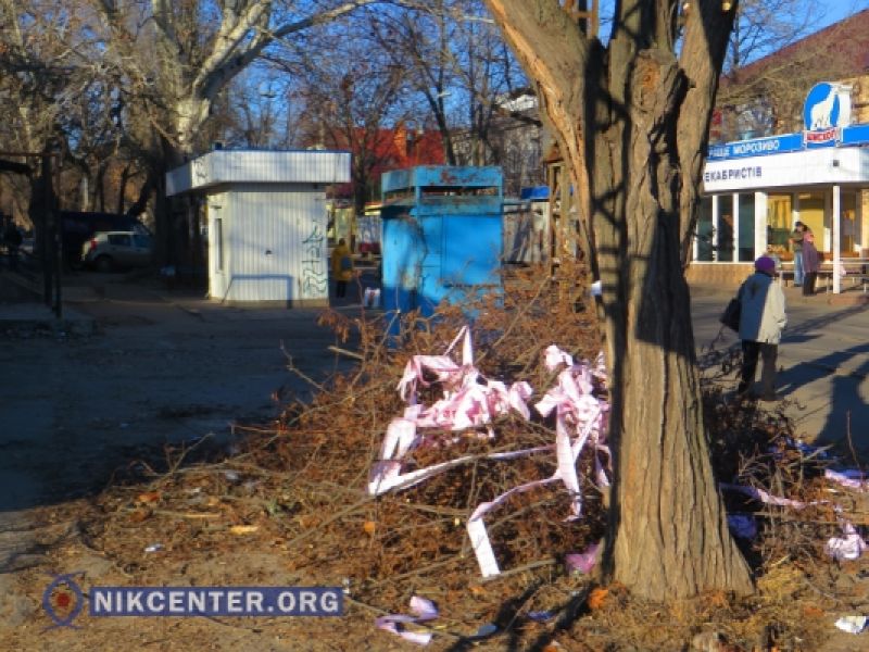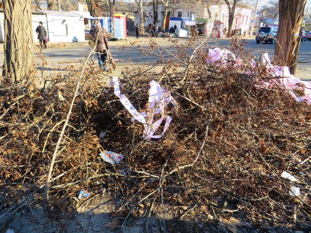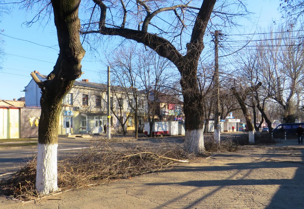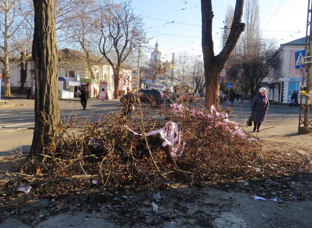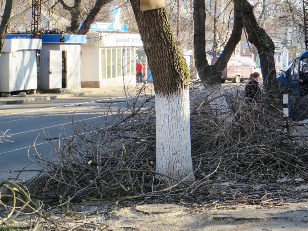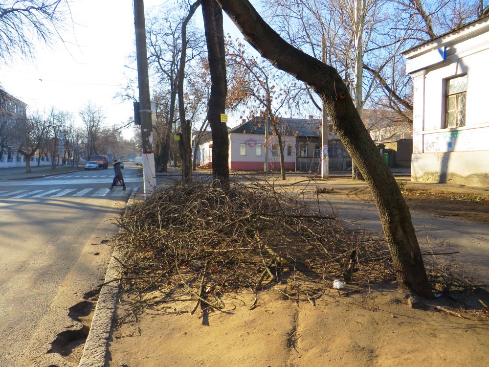 В Николаеве по ул. Потемкинской от ул. Декабристов до ул. Фалеевской коммунальные службы обрезали несколько деревьев, а срубленные ветки оставили лежать рядом с пешеходными дорожками.