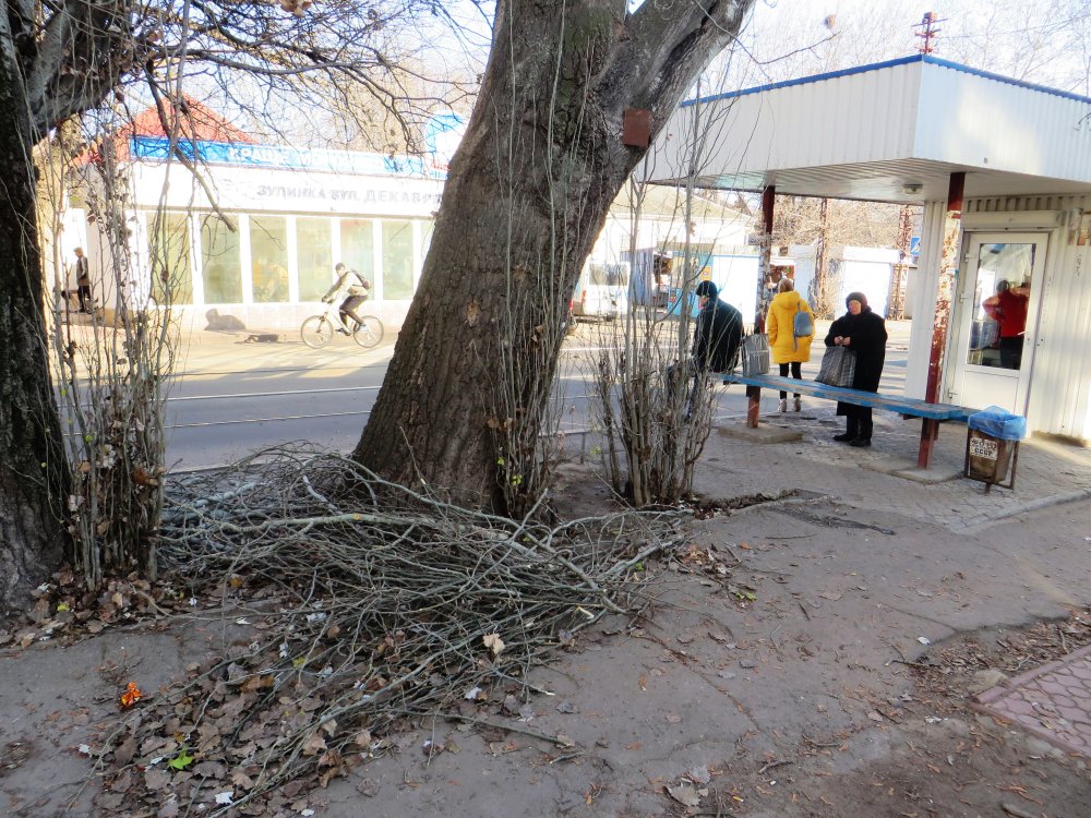 По его словам, в субботу, 12 декабря, обрезкой веток деревьев занимались представители фирмы «Эвако», однако и по сей день сухие ветки остаются лежать вдоль трамвайных путей, образуя свалку. Местные жители уже начали сносить сюда и другой мусор.