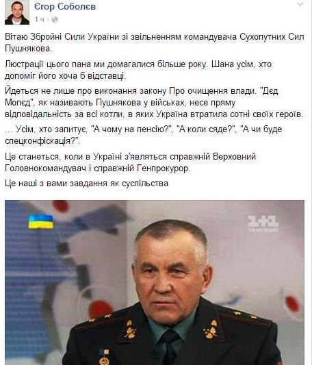 "Люстрации этого господина мы добивались больше года. Почет всем, кто помог его отставке. Речь идет не только о выполнении закона Об очищении власти. "Дед Мопєд", как называют Пушнякова в войсках, несет прямую ответственность за все котлы, в которых Украина потеряла сотни своих героев", — сообщил нардеп на своей странице в Facebook.