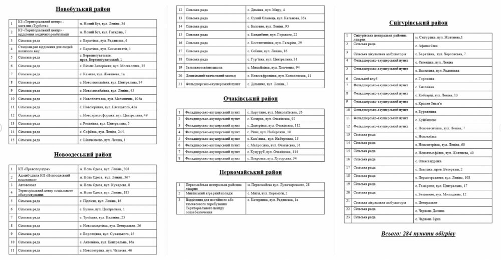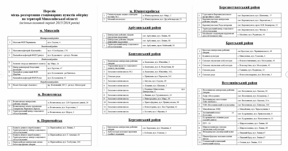 Перечень мест развертывания стационарных пунктов обогрева на территории Николаевской области можно посмотреть по ссылке.