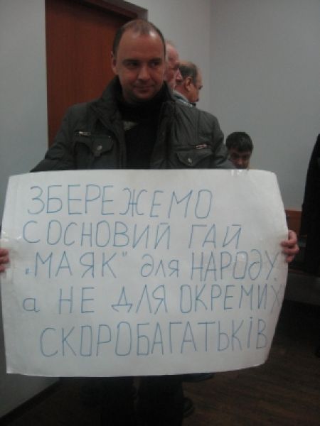 Традиционно в судебное заседание в помещение гражданской палаты Апелляционного суда Николаевской области явились общественные активисты во главе с Игорем Деревянко. Они развернули самодельные плакаты следующего содержания: «Сохраним сосновую рощу «Маяк» для народа, а не для отдельных нуворишей» и «Уничтожение леса «Маяк» — стрельба в спину бойцам на фронте».