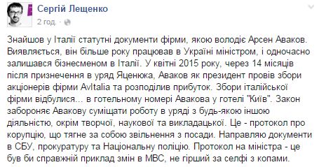 Народный депутат Украины из фракции Блок Петра Порошенко Сергей Лещенко заявил, что министр внутренних дел Арсен Аваков больше года занимал должность в Кабинете министров, параллельно возглавляя итальянскую компанию.