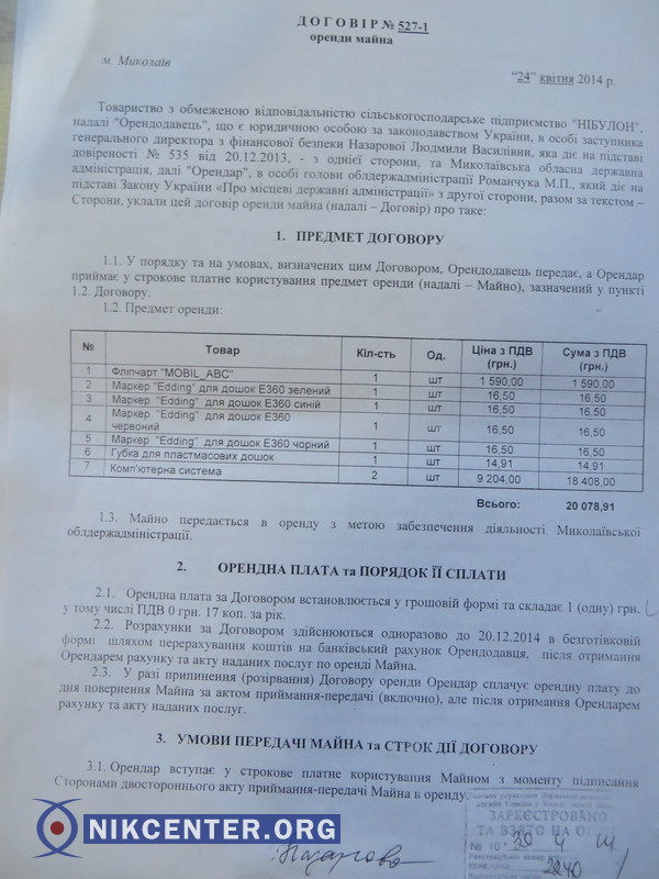 Николаевская облгосадминистрация арендует у ООО «Сельскохозяйственное предприятие «НИБУЛОН» всего за одну гривну в год две компьютерные системы (одна стоимостью 9 тыс. 204 грн.).