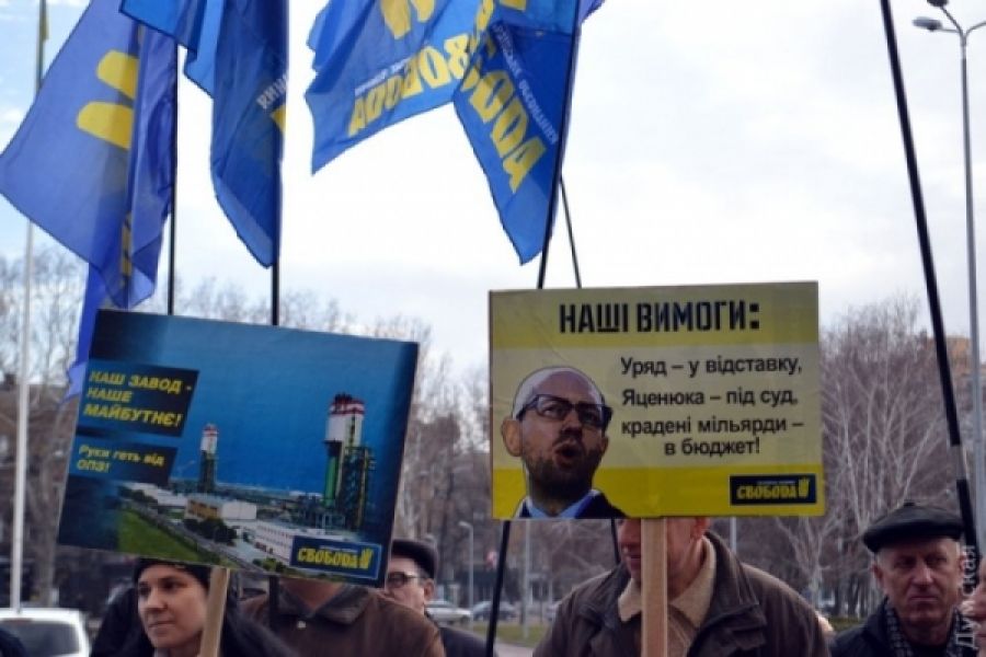 Примерно 50 активистов партий «Свобода» и «Сила людей» требовали отставки Кабинета Министров Украины, пишет «Думская».