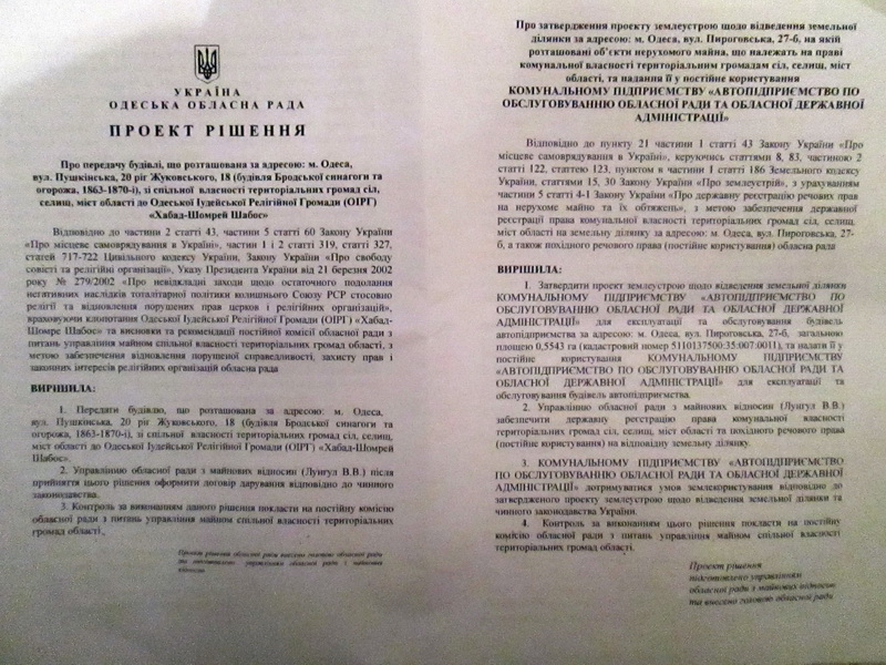 По ее словам, здание, расположенное на улице Жуковского в центре Одессы, которое ныне является помещением Государственного архива Одесской области, собираются вернуть Одесской иудейской религиозной общине «Хабад-Шомрей Шабос».