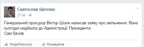 «Генеральный прокурор Виктор Шокин написал заявление об увольнении. Она сегодня поступила в Администрации Президента», — говорится в сообщении Цеголко.