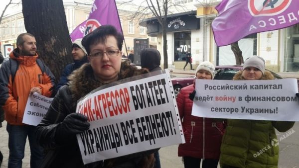 По словам участников мероприятия, они выступают против российского бизнеса, который на сегодняшний день владеет 30% финансового сектора Украины.