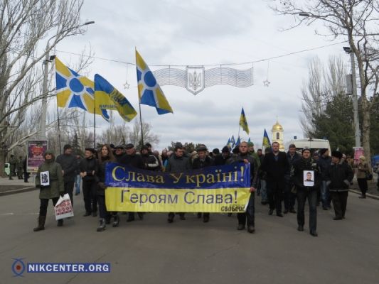 Мероприятие началось на центральной площади города, на месте сбора николаевского Евромайдана. Перед несколькими сотнями человек выступили: председатель ОГА Вадим Мериков, нардеп Тарас Креминь, глава облсовета Виктория Москаленко, городской голова Александр Сенкевич, председатель Николаевской краевой организации Народного Руха Украины Юрий Диденко, глава Николаевской областной организации партии «Демократический альянс» Евгения Матейчук, председатель Николаевской областной организации ВО «Свобода» Демид Губский.
