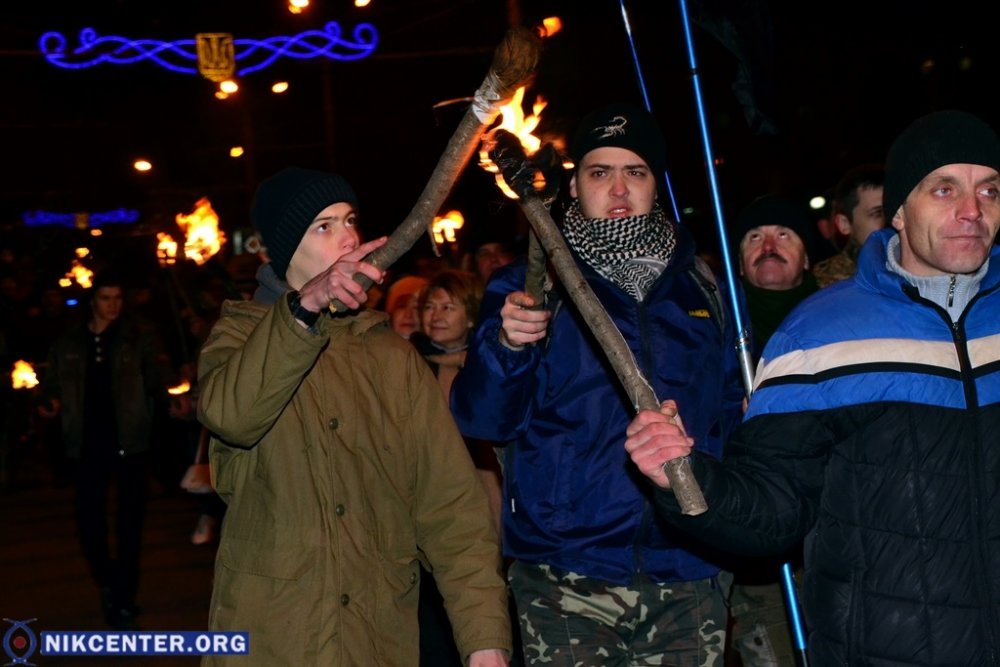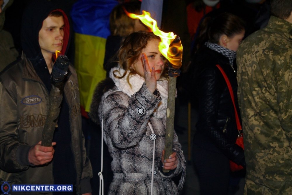 Они прошли по центру города факельным шествием от площади Свободы, где расположен монумент в честь Небесной сотни и херсонцев, погибших в зоне АТО, к мемориальному комплексу "Слава Украине!".