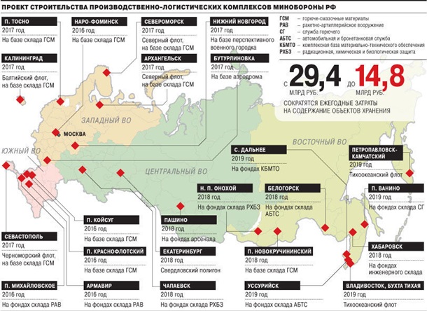 Минобороны намерено создать 24 перевалочно-логистических комплекса, которые к 2020 году должны заменить 330 баз и складов на территории РФ, пишет российское издание Коммерсант.