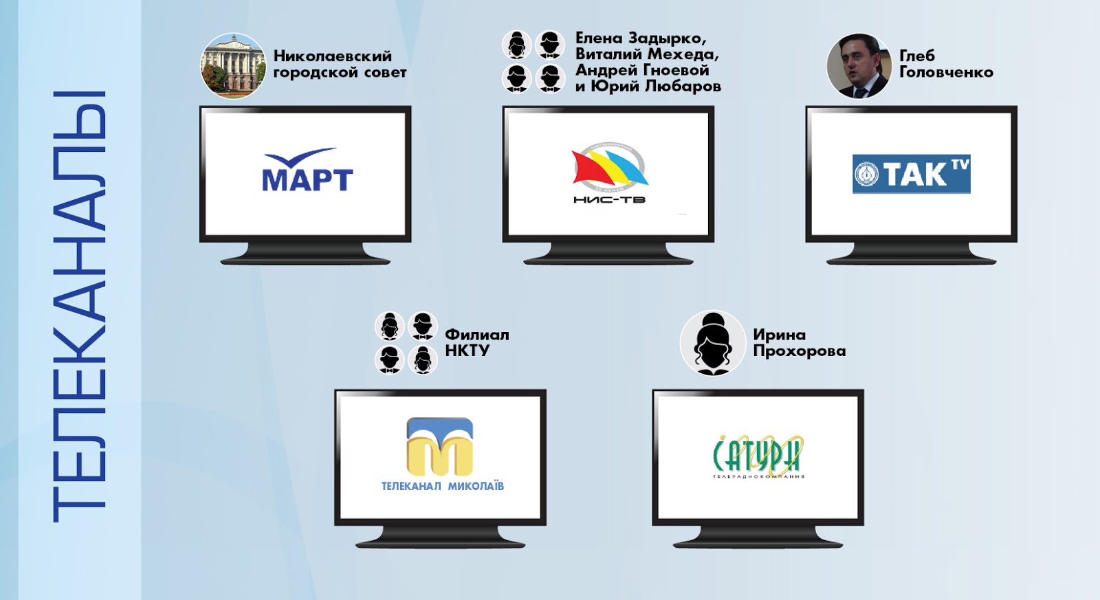 Пользуясь данными открытых источников (Реестр Национального совета по вопросам телевидения и радиовещания, Единый реестр юридических лиц, Перечень зарегистрированных печатных средств массовой информации), а также инсайдерской информацией, мы попытались выяснить, в чьих руках находится информационное поле Николаева и Херсона.