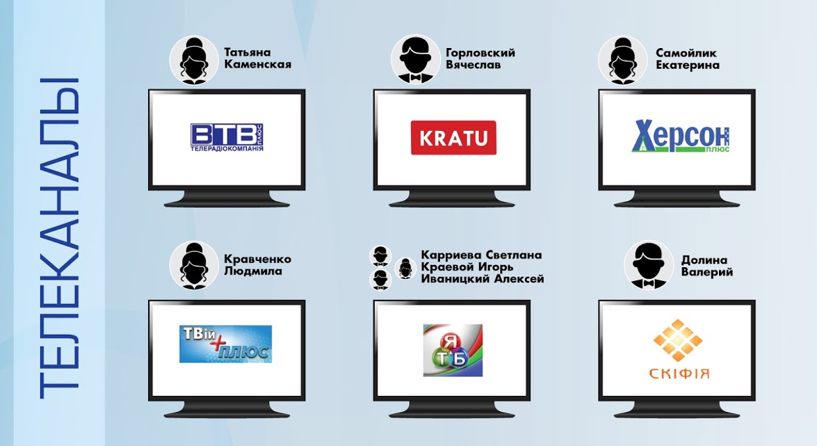 Из них наиболее популярны: канал «ВТВ», которым официально владеет Татьяна Каменская (на нее оформленно ЧП, которое получило лицензию). Руководит каналом Татьяна вместе со своим сыном Виталием. Каменские достаточно известные в Херсоне журналисты и медиа-менеджеры. Вторая по популярности в регионе – «государственная «Скифия», руководит которой Валерий Долина, глава областной организации НСЖУ.