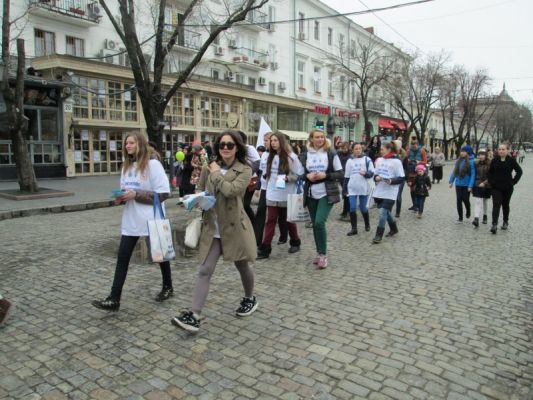 Активистки общественного движения «Вера, Надежда, Любовь» начали путь возле памятника Дюку и, запустив в небо сине-желтые шары, двинулись по Приморскому бульвару к Оперному театру, через улицу Ришельевскую в Городской сад. По ходу марша женщины раздавали сладости детям и брошюры прохожим.