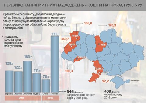 "954,7 млн гривен направлено на развитие инфраструктуры в регионах благодаря перевыполнению плана поступлений таможнями ГФС в рамках эксперимента, который был начат в сентябре 2015 года", — говорится в сообщении.