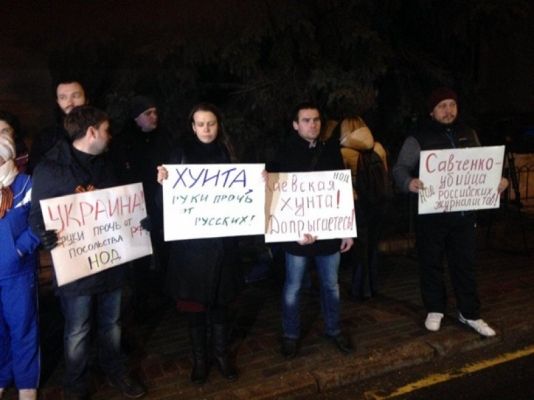 Участники акции скандируют лозунги: "Руки прочь от наших дипломатов". В руках у них плакаты: "Киевская хунта доиграется", "Украина – ты больна. Опомнись, что ты творишь", а также несколько российских триколоров.