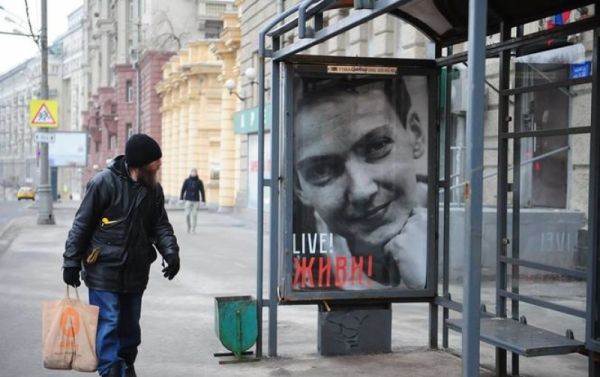 Пользователь Facebook опубликовал фотографию остановки на Садовом кольце в Москве, на которой размещен плакат с портретом украинской летчицы и народного депутата Надежды Савченко, незаконно удерживаемой в РФ.