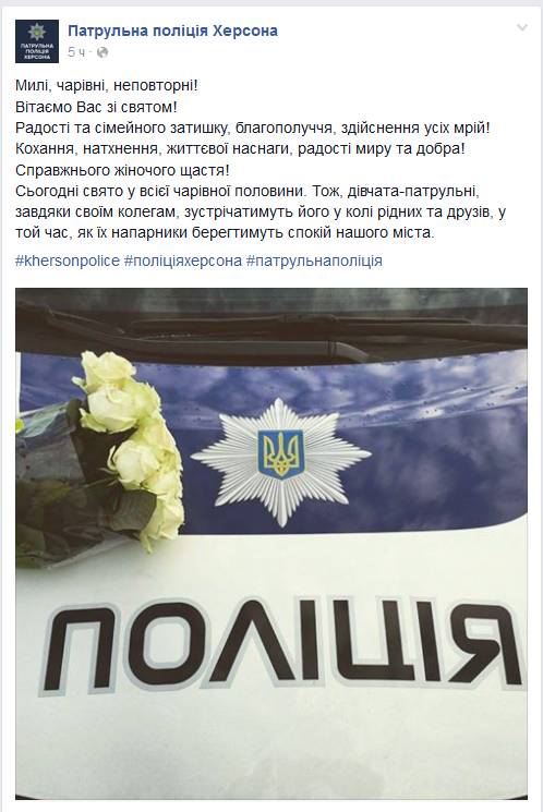 "Сегодня праздник у всей прекрасной половины. Поэтому, девушки-патрульные, благодаря своим коллегам, встречают его в кругу родных и друзей, в то время, как их напарники будут хранить спокойствие нашего города", — сказано в сообщении на странице Патрульной полиции Херсона в Facebook.