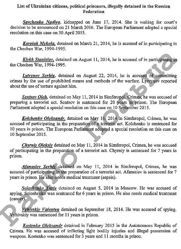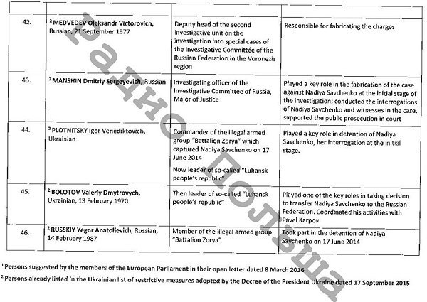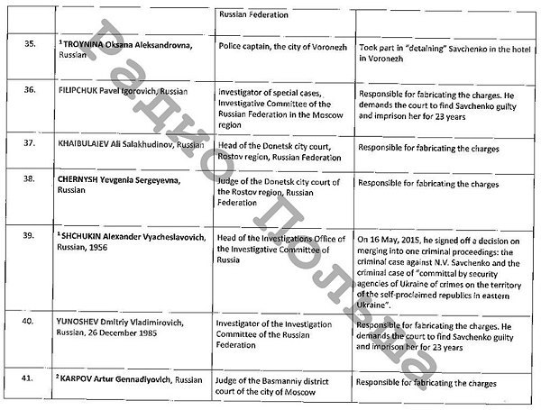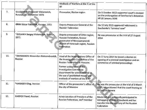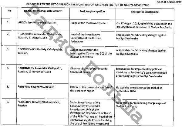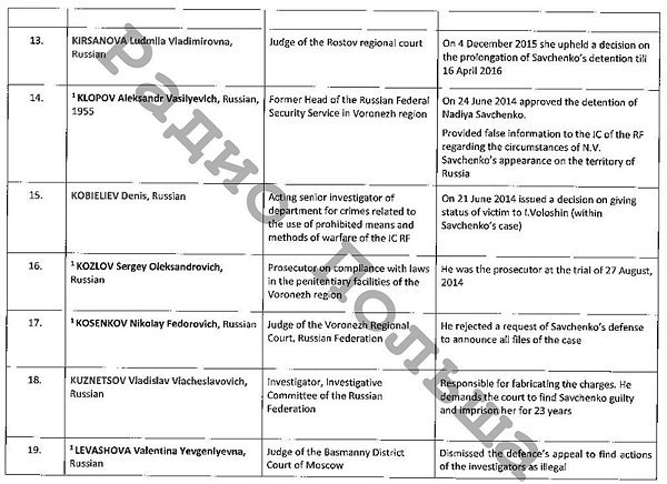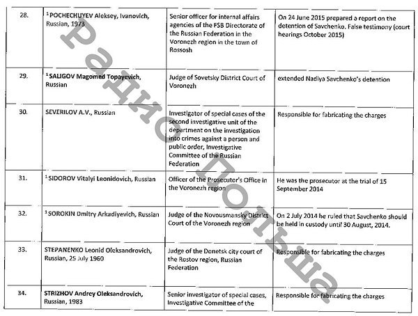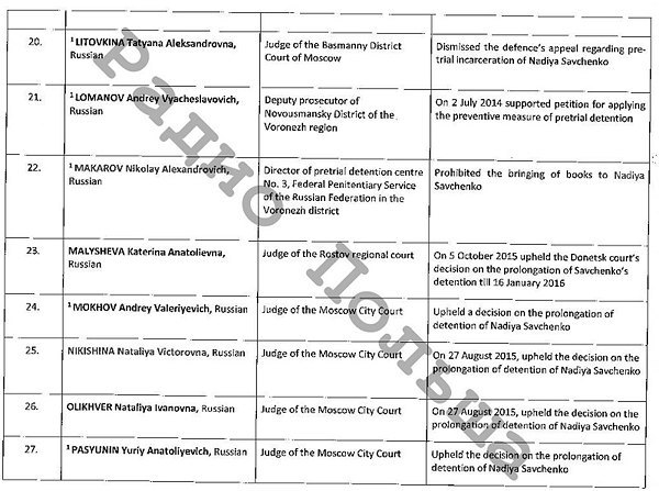 Полный перечень, озаглавленный как "Предложения по списку лиц, ответственных за незаконное удержание Надежды Савченко" обнародовало издание "Радио Польша".