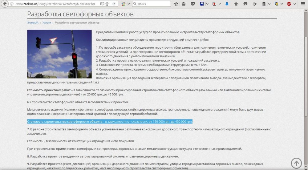 Также на сайтах специализированных предприятий можно найти информацию о том, что 150 000 грн. — это минимальная стоимость строительства светофорного объекта.