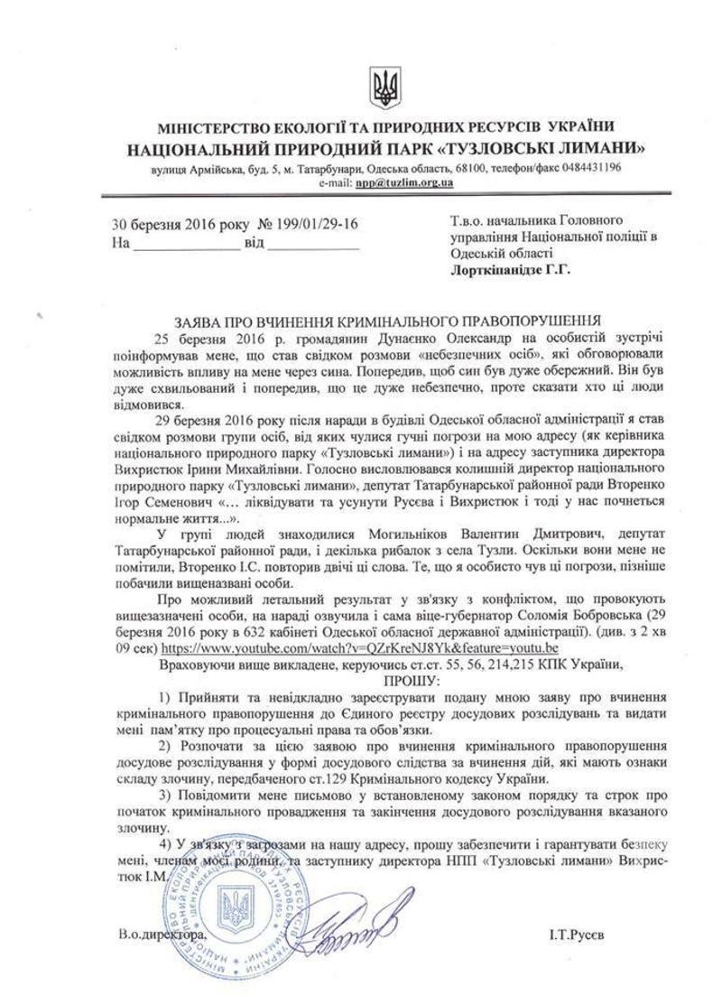 директор, заявление, национальный парк, Одесская область, угрозы