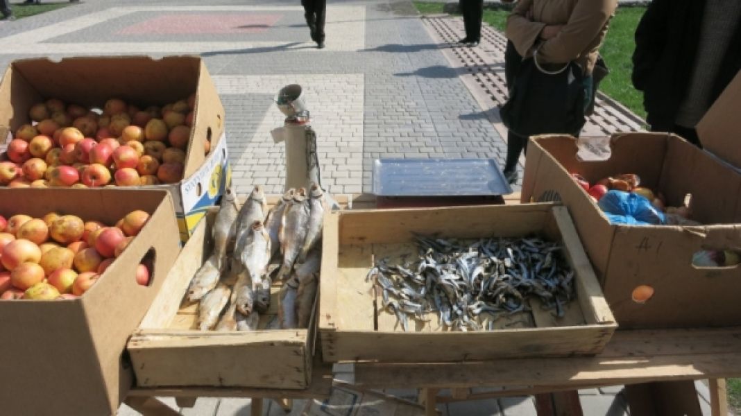 В знак протеста против несостоятельности власти, которая не может обеспечить людей работой продавцы установили перед входом в горисполком лотки для раскладки товара и собственно сам товар.