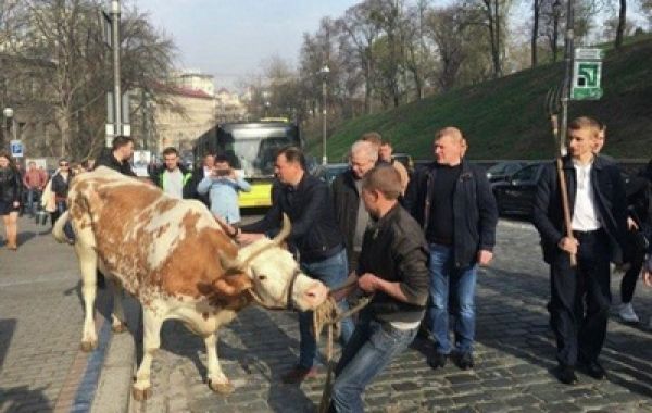 В Киеве протестующие фермеры привели под здание Кабмина коров