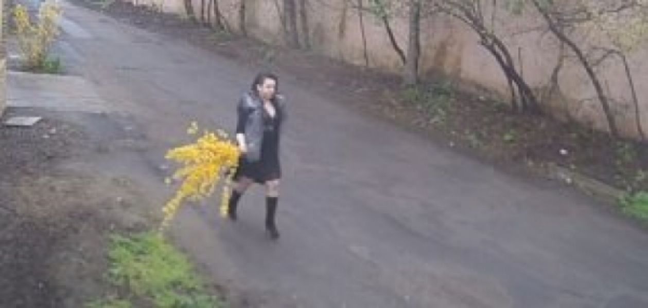 На видео видно, как иномарка останавливается недалеко от цветущего куста форзиции, выходит женщина в меховой жилетке и начинает рвать ветки.