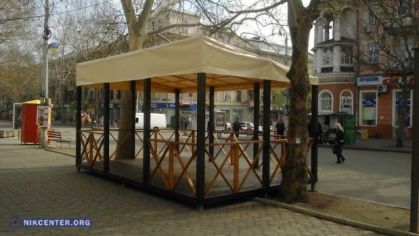 Установленная за ночь летняя площадка на углу улиц Потемкинской и Соборной в Николаеве на газоне между деревьями напротив бара «Нули» является незаконной.