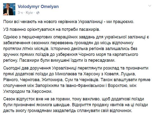 — Одной из первоочередных операционных задач для украинской железной дороги является обеспечение сезонных перевозок граждан к местам отдыха в течение летних месяцев. Исторически несколько регионов оставались без удобных прямых поездов до побережья Черного моря и карпатского региона. Пассажиры были вынуждены ездить с пересадками, — отметил министр.