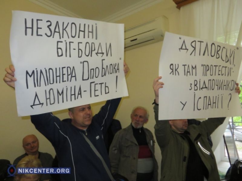 Держа в руках плакаты: «Долой незаконные билборды миллионера «Оппоблока» Дюмина!», «Дятловские, как там протесты с отдыхом в Испании?», «Оппоблок=Будкоград, а бюджету – дуля», — активисты требовали поддержать решение исполкома о сносе шести незаконных рекламных конструкций на углу пр. Богоявленского и ул. Космонавтов, со стороны рынка ООО «Универсал-юг».