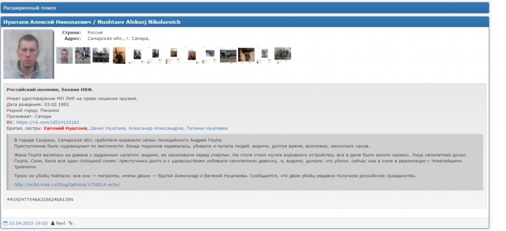 Позже стали известны также имена предполагаемых убийц. Ими оказались братья Нуштаевы, принимавшие участие в боях за ЛНР. Одного из них — Алексея Нуштаева — российская журналистка Юлия Латынина обнаружила в базе «Миротворец». В той же базе есть и его брат Евгений Нуштаев.