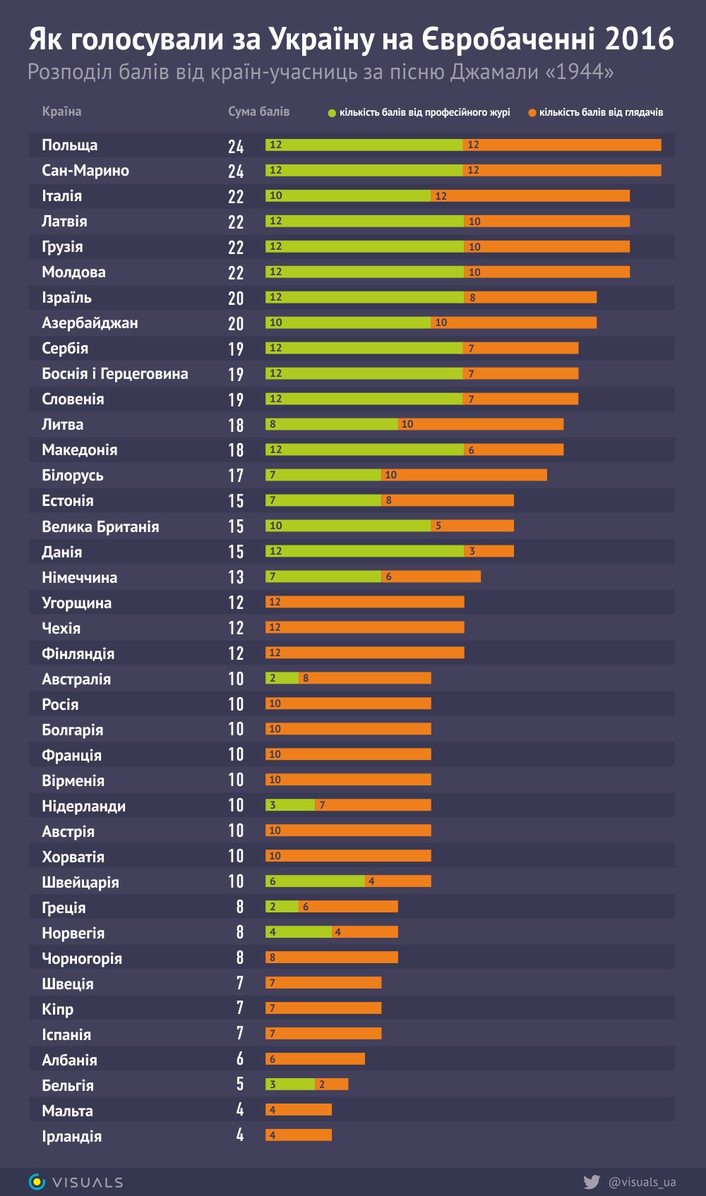 Максимальный балл Джамала получила от зрителей Польши, Сан-Марино, Италии, Венгрии, Чехии и Финляндии.