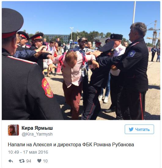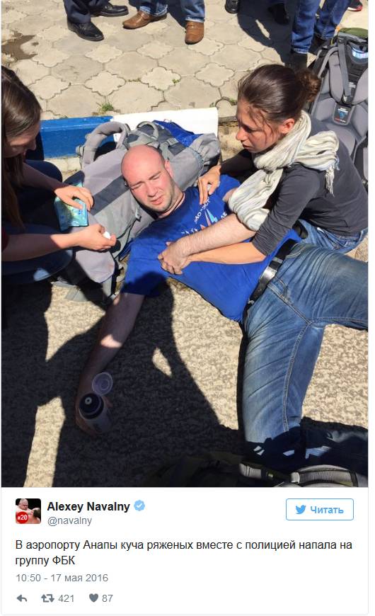 На российского оппозиционера Алексея Навального и сотрудников Фонда борьбы с коррупцией во вторник, 17 мая, неизвестные напали в аэропорту Анапы. Об этом сообщил сам политик и другие свидетели инцидента в сети микроблогов Twitter. "На Навального и ФБК напали у аэропорта Анапы. Артема Торчинского избили, он лежит на земле, висок разбит", — написала пресс-секретарь Навального Кира Ярмыш у себя в микроблоге. По ее словам, избили также директора ФБК Романа Рубанова.