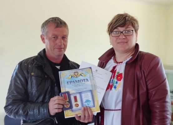Награду волонтеру вручил Владимир Афоненко, сержант 26-й бригады, участник АТО на востоке Украины, который недавно вернулся с передовой. Награждение проходило в присутствии депутата Первомайского районного совета, участника боевых действий в зоне АТО Александра Грищенко.