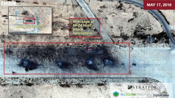На спутниковой съемке базы, предоставленной Stratfor в распоряжение каналу ВВС, видны обгоревшие остовы, стоящие в ряд на взлетной полосе, и руины здания, располагавшегося на территории базы.