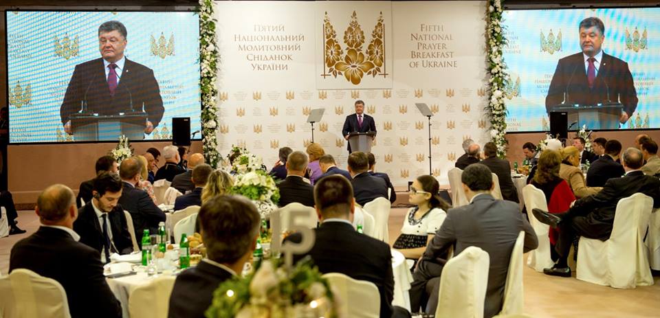 "В это время, когда страна борется против российского агрессора, особенно остро ощущается потребность в единстве страны ради мира, свободы, достойного будущего. А это может произойти только тогда, когда разные люди, с отличными взглядами и позициями, объединяются в совместной молитве к Господу за мир и согласие на нашей украинской земле. Мне приятно, что здесь собрались известные отечественные и зарубежные политики, чиновники, представители Всеукраинского совета церквей и религиозных организаций. Это прекрасная возможность для общения и полного взаимопонимания", — сказал Порошенко.