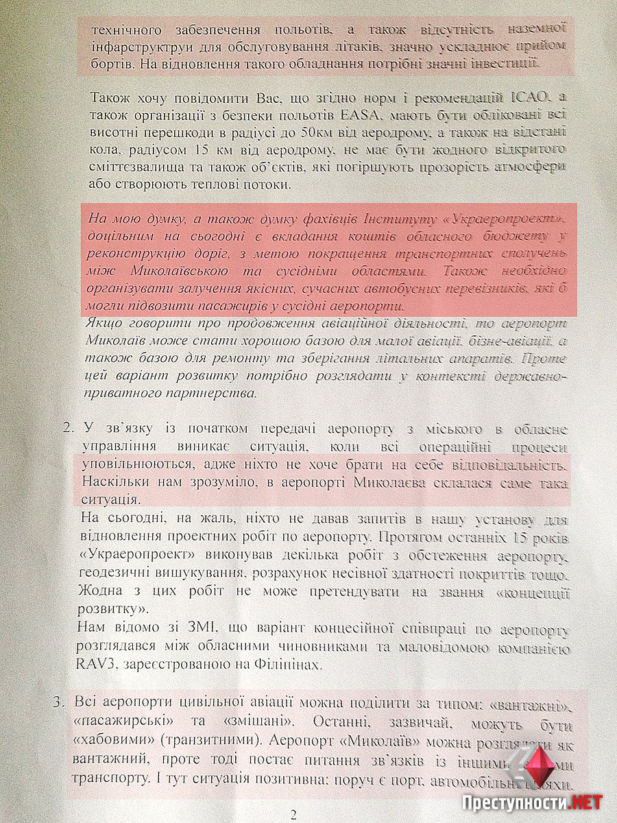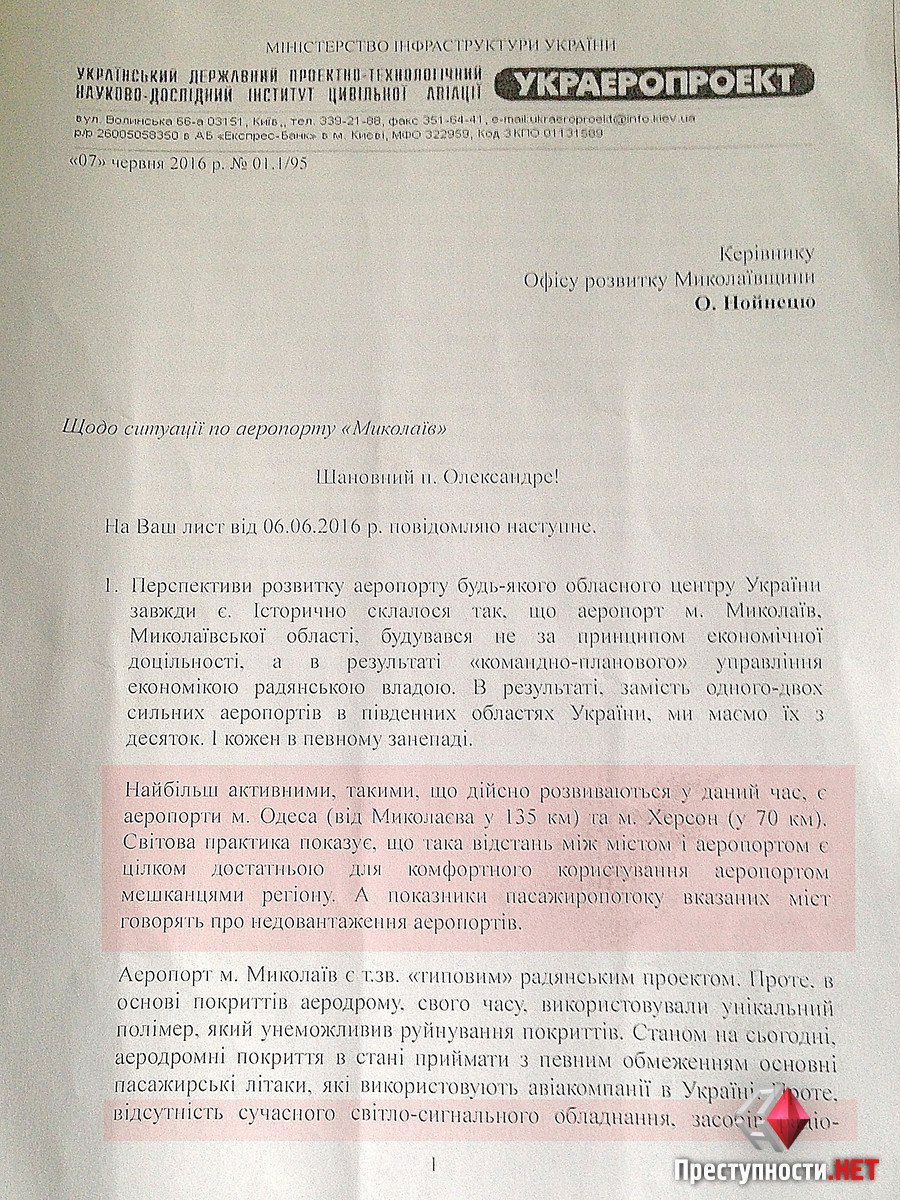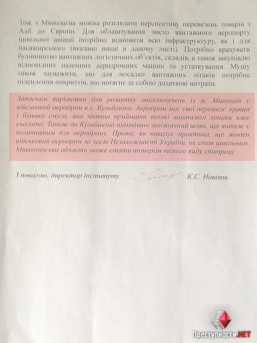 В Украинском государственном проектно-технологическом научно-исследовательском институте гражданской авиации «Украэропрект» советуют николаевским властям вместо местного аэропорта вкладывать деньги в улучшение качества дорог в направление Херсона и Одессы.