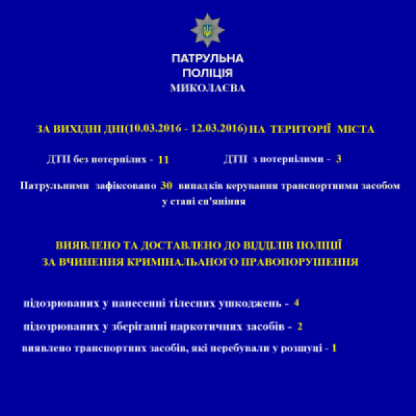 Также за прошедшие выходные дни на территории Николаева произошло 14 ДТП, в 3 из которых есть пострадавшие.