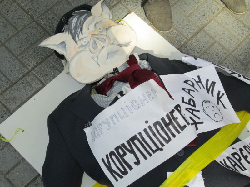 Сначала общественники пронесли чучело по центральной улице Николаева — Соборной — с просьбой к прохожим присоединиться к акции против коррупции.