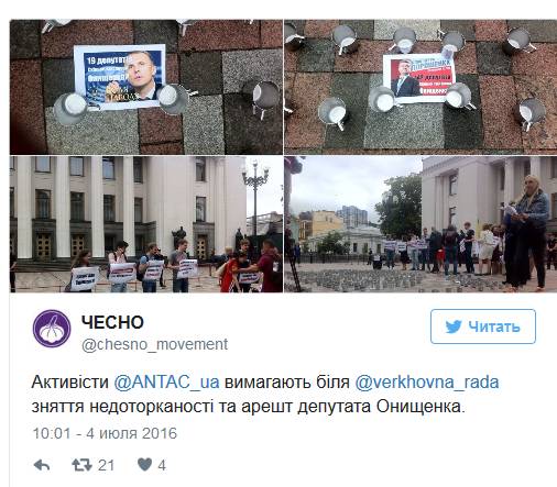Активисты Центра противодействия коррупции проводят акцию перед зданием Верховной Рады, требуя снятия неприкосновенности и ареста депутата Александра Онищенко.