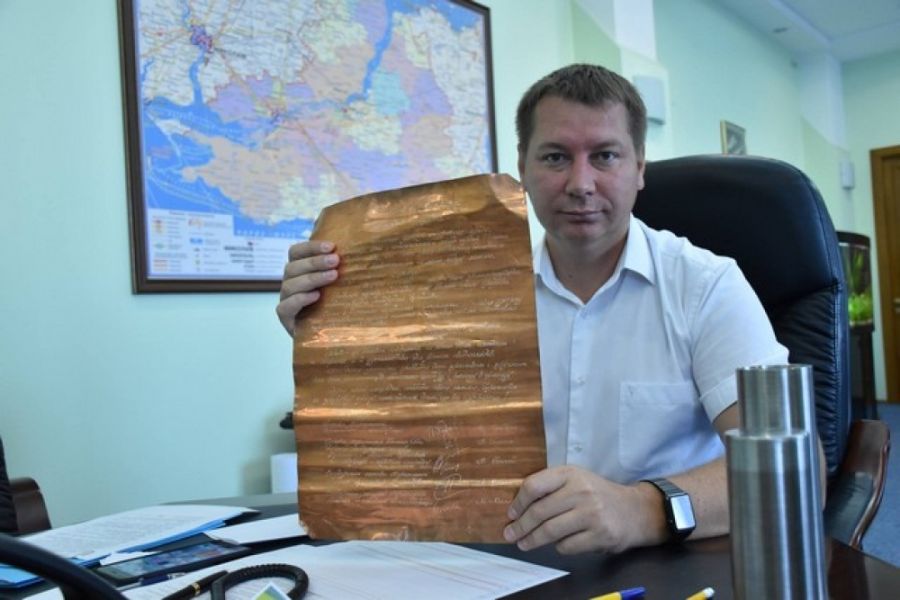 Председатель Херсонской ОГА Андрей Гордеев принес в студию ОГТРК «Скифия» капсулу, которую бывшие представители областной власти заложили под строительство мостоперехода в Херсоне еще четыре года назад.