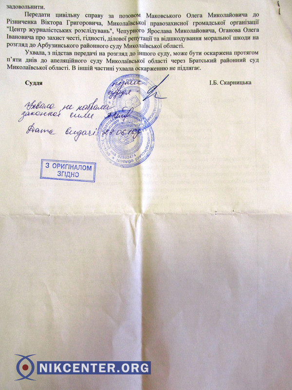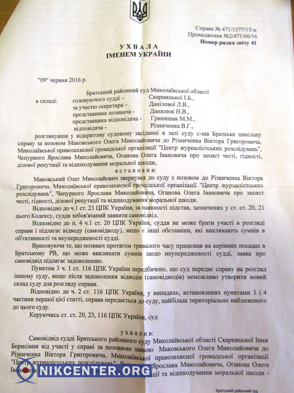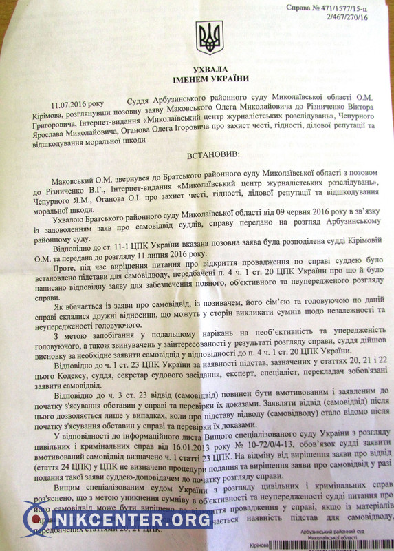 11 июля судья Арбузинского районного суда Николаевской области Ольга Киримова взяла самоотвод в деле по иску полковника милиции Олега Маковского, исполнявшего обязанности начальника Вознесенского отдела полиции, который он подал против репортеров Центра журналистских расследований Ярослава Чепурного и Олега Оганова.