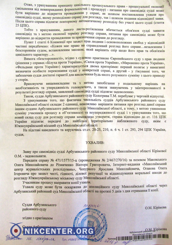 В свою очередь, судья Арбузинского районного суда Николаевской области Ольга Киримова, руководствуясь тем, что с истцом и его семьей у нее сложились дружеские отношения, тоже взяла самоотвод.