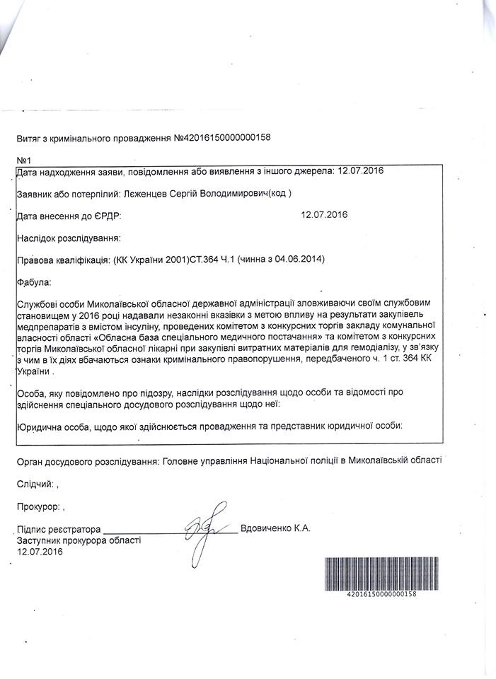 «Проведение досудебного расследования поручено следственному управлению Главного управления Национальной полиции в Николаевской области. 1. Уголовное производство № 4201615000000158 по ч.1 ст.364 УК Украины. (Злоупотребление властью или служебным положением). Должностные лица Николаевской облгосадминистрации злоупотребляя своим служебным положением в 2016 году давали незаконные указания с целью влияния на результаты закупок медикаментов с содержанием инсулина, проведенных комитетом по конкурсным торгам заведения коммунальной собственности области "Областная база специального медицинского снабжения" и комитетом по конкурсным торгам Николаевской областной больницы при закупке расходных материалов для гемодиализа, в связи с чем в их действиях усматриваются признаки уголовного преступления, предусмотренного ч.1 ст.364 УК Украины. 2. Уголовное производство № 4201615000000159 по ч.1 ст.366 УК Украины (Служебный подлог)», — рассказал Денис Жело.