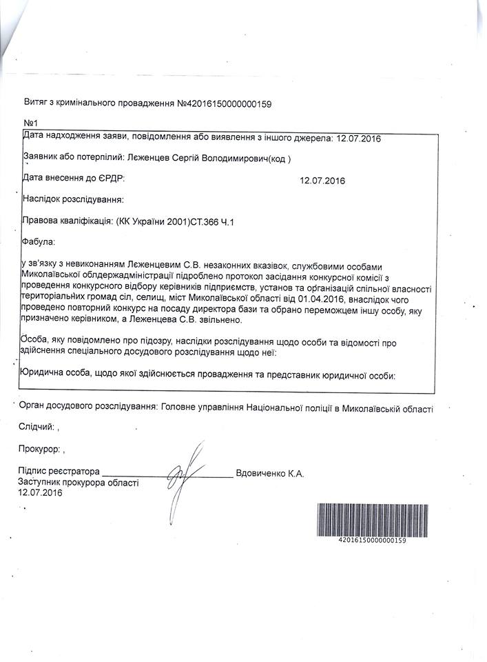 Денис Жело сообщил, что должностные лица Николаевской ОГА подделали протокол заседания конкурсной комиссии по проведению конкурсного отбора руководителей предприятий, учреждений и организаций общей собственности территориальных громад сел, поселков, городов Николаевской области от 01.04.16г., в результате чего был проведен повторный конкурс на должность директора базы и победителем выбрали другого человека, а Леженцева уволили.